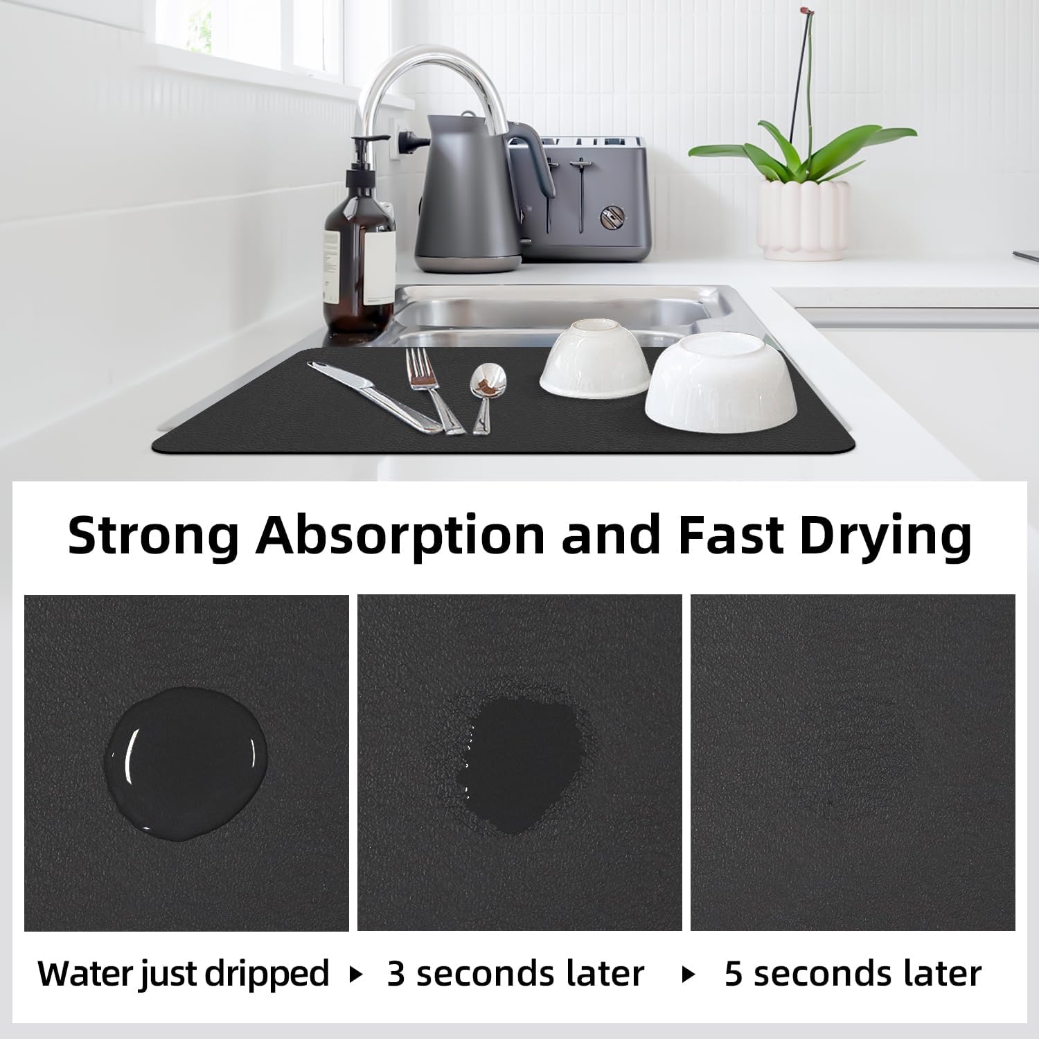 Su base antideslizante evita que se resbalen los objetos y absorbe hasta 4 veces su peso en agua, secando rápido y protegiendo la encimera de rayones y humedad. Fácil de limpiar, duradera y plegable.